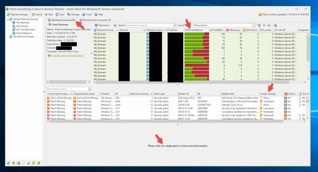 21. Back to the main console, I can see more detailed results of the scan. I can click on a single server on the top screen or a single patch in the middle screen to get more details: